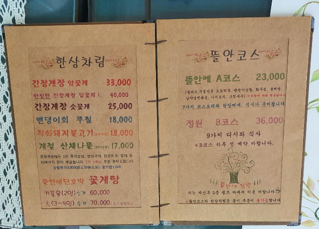 처음 뜰안에 정원으로 가기로 결정 했던 것은 밴댕이회무침과 간장게장정식을 판매 한다는 것을 검색으로 알아낸 게 이유였는데요 그러면 뜰안에 정원의 메뉴판을 한번 함께 보겠습니다ㅎㅎ