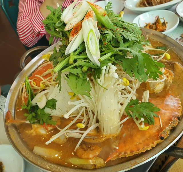 꽃게탕은 돌솥밥이 나와서 돌솥밥과 함께 먹을 수 있는 것이 장점이었습니다 푸짐한 꽃게탕 비주얼 한번 감상하시지요.....ㅠㅠㅠ 따흑