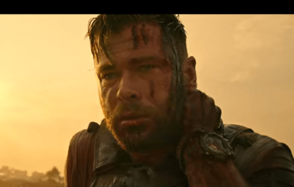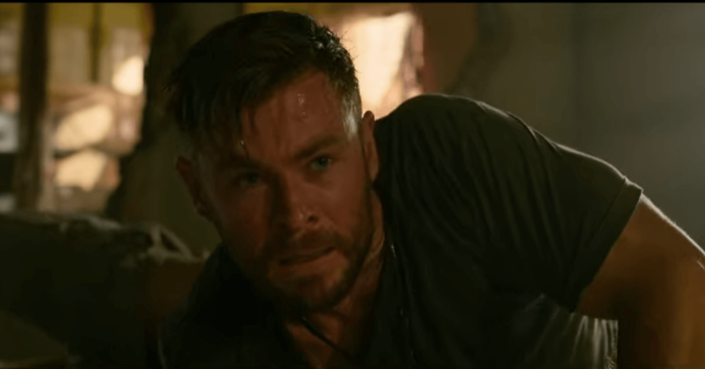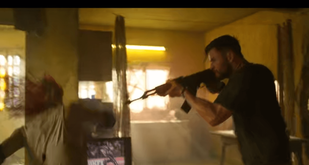 영화 마지막 피날레 장면을 서두에 배치한 형식. 피범벅이 된 크리스 헴스워스(타일러 역)가 총알을 휘갈기는 격투를 벌입니다. 어린 아이의 다리가 비춰지며, 그의 흐릿한 회상장면과 오버랩되는 피묻은 크리스의 모습 비춰지고-