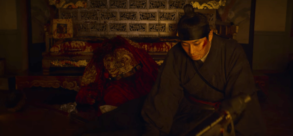 총에 맞자 죽기 일보 직전의 상태로 잠긴 문을 열자, 좀비 왕이 서있습니다. 이내 잘려 떨어져나가는 목, 그 뒤로 낙심한 세자 창이 서 있습니다.