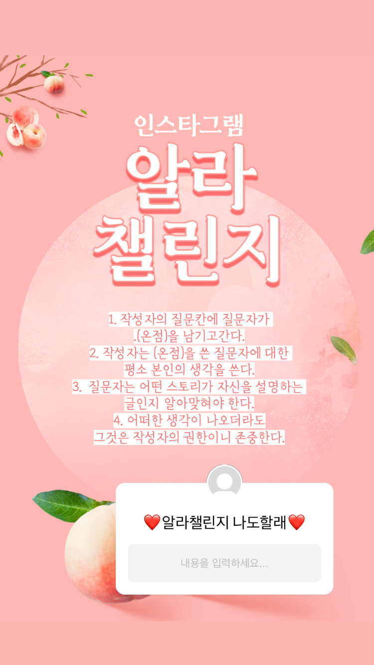 알라챌린지 작성자로서 방법은 인스타그램 스토리에 아래와 유사한 내용을 포함하여 질문을 포함한 스토리를 올린다.
