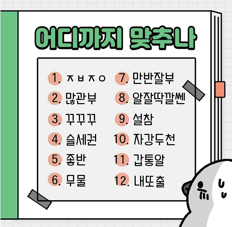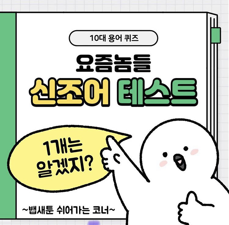 요즘애들 신조어테스트로 인스타그램 뱁새 계정에서 10대용어 신조어 퀴즈를 내었는데 ㅋㅋㅋㅋ 진짜 모르는거 투성이네요